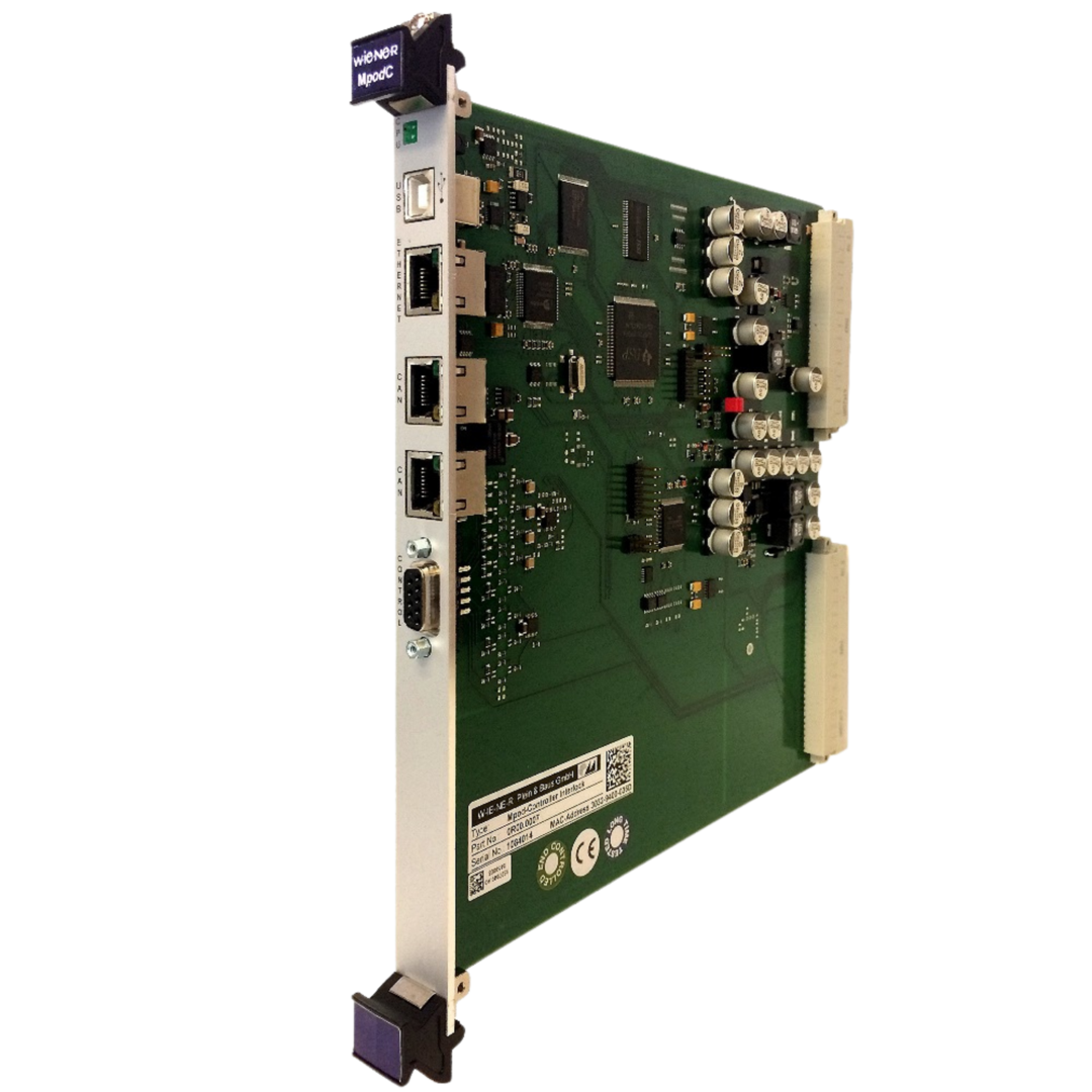 Half-slot communication controller for MPOD/MMS systems. The MPOD-C manages internal power supply and all HV/LV modules via internal CAN-bus. Enables user communication through Ethernet, USB2, and dual CAN-bus ports, with remote access via SNMP and web interface.